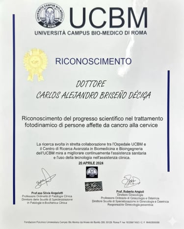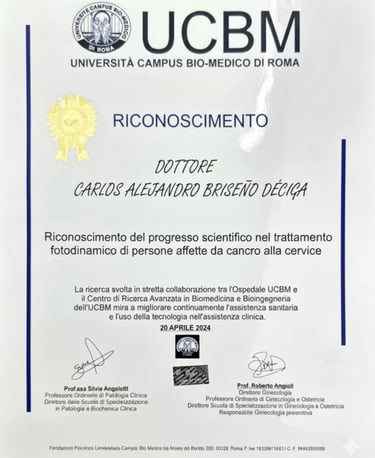 Agradecemos a la Universidad Bio-Médica de Roma por el reconocimiento otorgado a nuestro fundador, debido a su avance notable en el uso de la terapia fotodinámica para el tratamiento del cáncer cervicouterino.